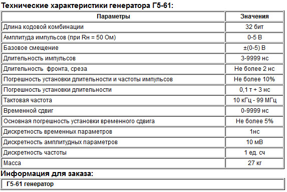 Генератор Г5-61- источник сложных видов выходных последовательностей импульсов на высоких тактовых частотах. Применяюется для измерения статических, динамических и функциональных параметров импульсных и микроэлектронных устройств. Генератор Г5-61 отличается широким диапазоном программирования основных параметров и высокой тактовой частотой (до 100 МГц).