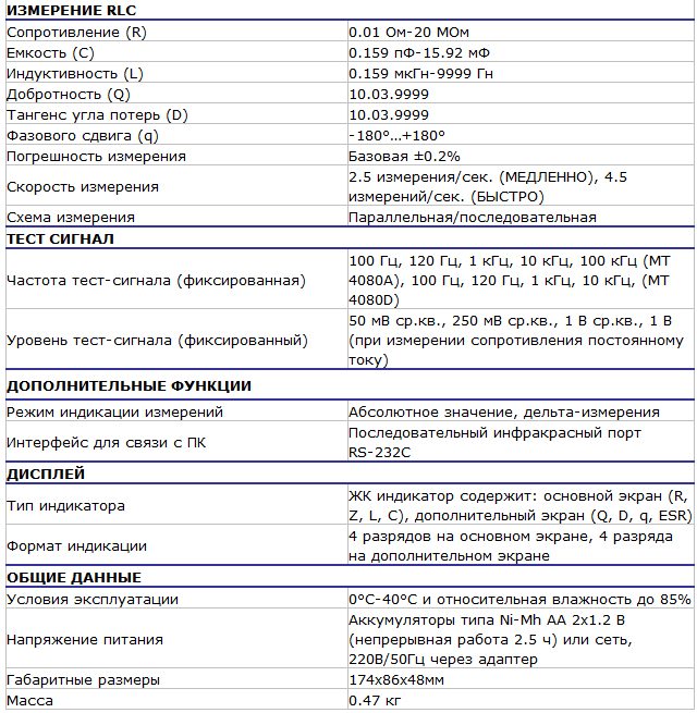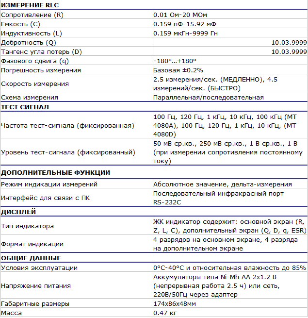• Широкий диапазон параметров тест-сигнала: частота 100Гц, 120Гц, 1 кГц, 10 кГц, 100 кГц; уровень 0.05 В, 0.25 В, 1 В