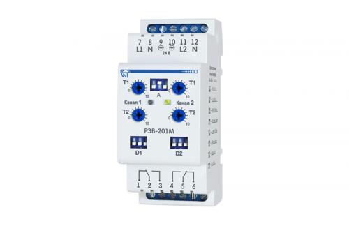 Реле времени электронное двухканальное с задержкой на включение и отключение РЭВ-201М предназначено для коммутации электрических цепей переменного тока 220В/50Гц и постоянного тока 24-100В с регулируемой задержкой времени включения от 0 до 36000с.