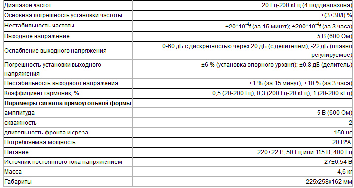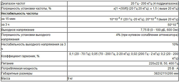 Генератор RС-типа с плавной установкой частоты в пределах каждого из четырех поддиапазонов. В генераторе обеспечивается выходной сигнал прецизионной формы. Гарантирустся низкий уровень побочных составляющих, в том числе сигналов с чистотой питающей сети и ее гармоник.