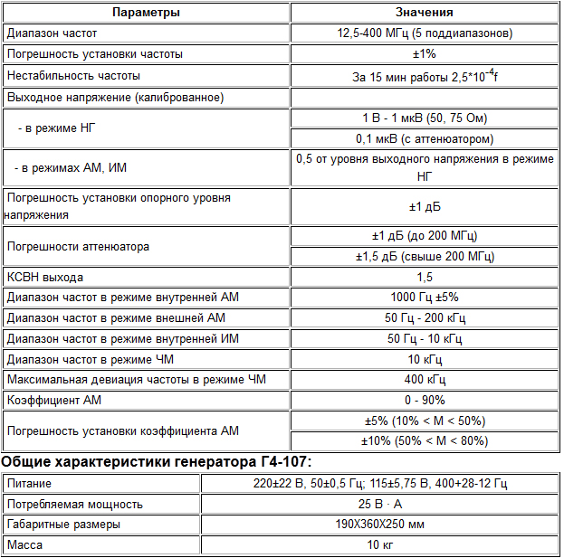 Генератор Г4-107 - источник сигналов, калиброванных по частоте, величине сигнала и коэффициенту модуляции. Прибор предназначен для поверки и настройки радиоприемной и радиопередающей аппаратуры в заводских и лабораторных условиях. Возможно использование генератора в режимах совмещенных видов модуляции.